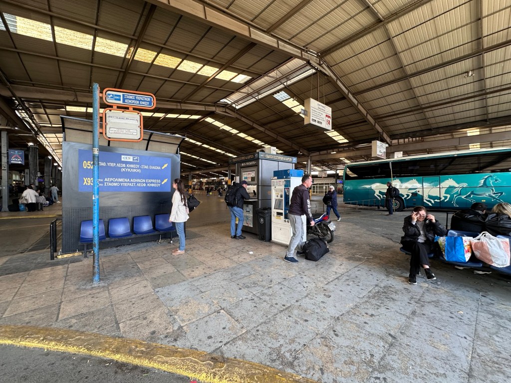 The bus to Athens is by comfortable bus> taking four and a half hours including a short rest-break. The bus terminates at the Athens “KTEL Terminal A” bus station> at bay 39. Right next to this bay is a taxi rank and local buses.