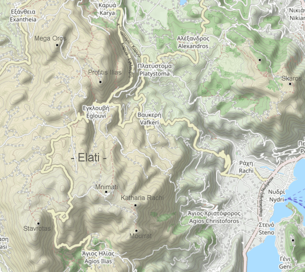 The tallest peak at 1182m is Stavrotas. This forms a long north-south ridge buttressing the western side of Mt Elati with impressive, impenetrable cliffs and scree. However it is climbed easily from the north and east.